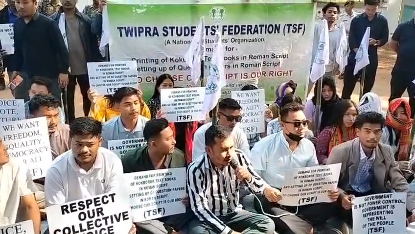 আগরতলা প্রতিনিধি, ২৫ নভেম্বর :মঙ্গলবার ককবরক ভাষা রোমান হরফ ব্যবহারের দাবিতে সার্কিট হাউসস্থিত গান্ধী মূর্তির পাদদেশে আন্দোলন বিক্ষোভে সামিল হল ছাত্র সংগঠন টিএসএফ। এদিন আন্দোলনকে ঘিরে সার্কিট হাউস এলাকায় বিশাল পুলিশ বাহিনী ও টিএসআর বাহিনী মোতায়েন করা হয়েছে। এদিন আন্দোলনকারী ছাত্র সংগঠন টিএসএফ এর নেতৃত্ব দের দাবি, ককবরক ভাষার উন্নয়ন ও স্বচ্ছ শিক্ষাব্যবস্থা গড়তে রোমান স্ক্রিপ্টই সবচেয়ে উপযোগী। সেই দাবিকে সামনে রেখে বহুদিন ধরে আন্দোলন চালিয়ে আসছে সংগঠন। তাদের বক্তব্য রাজ্য সরকার তাদের এই দাবি মানছে না। এই কারণে একাধিকবার আন্দোলনমুখী হতে হয়েছে তাঁদের। ত্রিপুরা সরকার যদি ককবরক ভাষা রোমান হরফ ব্যবহারের দাবি শান্তিপূর্ণভাবে মেনে নিতো তাহলে এই আন্দোলন বিক্ষোভ করার দরকার হতো না বলে জানিয়েছেন তারা।