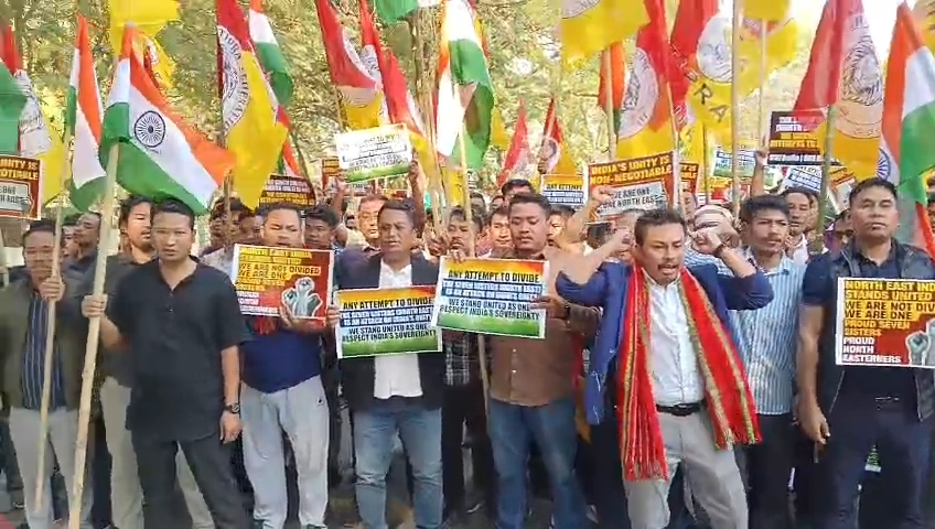 আগরতলা প্রতিনিধি,১৯ ডিসেম্বর:বাংলাদেশ বারংবার হুমকি দিয়ে আসছে ভারতের সেভেন সিস্টার দখল করার, তার পাশাপাশি বাংলাদেশে ভারতীয় ভিসা অফিসে গিয়ে এই হুমকি তারা দেয়। তারি প্রতিবাদে শুক্রবার আগরতলা বাংলাদেশ সহকারী হাইকমিশনের অফিসে বিক্ষোভ প্রতিবাদ প্রদর্শন করে তিপ্রা মথা দলের যুব সংগঠন YTF।তারা এদিন রাজধানীর সার্কিট হাউসের সামনে থেকে এক প্রতিবাদ মিছিল করে এবং বাংলাদেশ সহকারী হাইকমিশনের অফিসের সামনে প্রতিবাদ বিক্ষোভে সামিল হয়।এদিন প্রতিবাদ থেকে YTF–র নেতৃত্বরা বাংলাদেশ কে হুশিয়ারি দেয় এবং বলেন আগামী দিনে যদি বাংলাদেশ থেকে নর্থইস্ট নিয়ে কোনো হুমকি আসে তাহলে তারাও কক্সবাজার দখল করার দিকে এগোবে এমনটাই সংগঠনের তরফ থেকে হুশিয়ারি দেওয়া হয়।