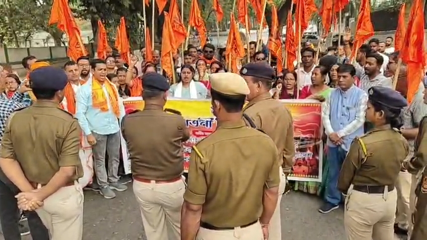 বাংলাদেশে সংখ্যালঘু হিন্দুদের উপর নির্যাতনের অভিযোগের প্রতিবাদে শনিবার আগরতলাস্থিত বাংলাদেশ সহকারী হাইকমিশন অফিসের সামনে বিক্ষোভ সনাতনী হিন্দু সেনার।