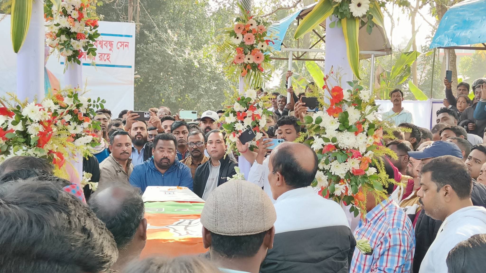 ধর্মনগরের রাজপথ জুড়ে হাজারো মানুষের উপস্থিতিতে ফুলে ফুলে সাজানো শবযাত্রায় চোখের জলে শেষ বিদায় জানান সাধারণ মানুষ। দলমত নির্বিশেষে সর্বস্তরের মানুষের অংশগ্রহণে এই শেষযাত্রা।