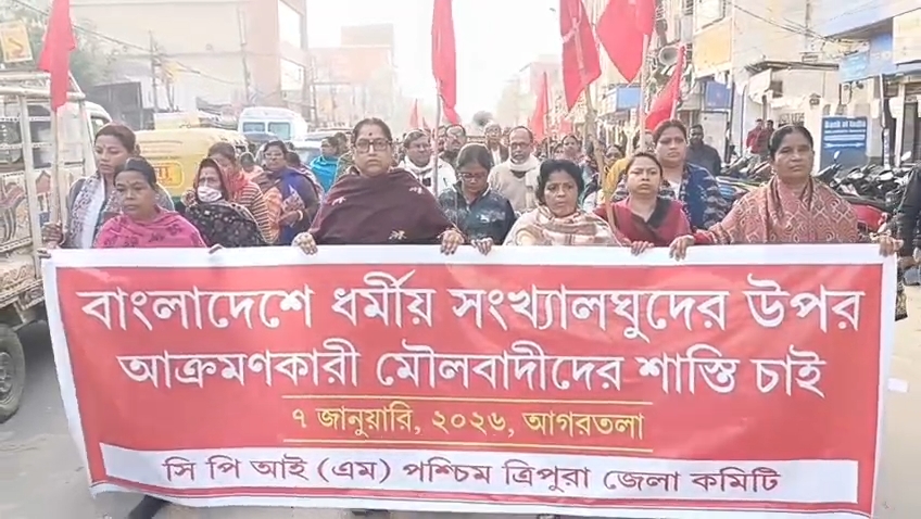 আগরতলা,৭জানুয়ারি:বাংলাদেশে বিগত কিছুদিন ধরে ধর্মীয় সংখ্যালঘু জনগণের উপর মৌলবাদী শক্তি বিভিন্নভাবে নৃশংস আক্রমণ সংগঠিত করে চলেছে। এই আক্রমণের প্রতিবাদে সিপিআইএম পশ্চিম ত্রিপুরা জেলা কমিটির ডাকে বুধবার আগরতলায় মিছিল ও সভা সংঘটিত করে।এদিন মেলার মাঠ থেকে মিছিলটি বের হয় সাম্প্রদায়িকতা ও মৌলবাদের বিরুদ্ধে এবং বাংলাদেশে হত্যাকাণ্ডের বিরুদ্ধে স্লোগান সোচ্চারিত মিছিল কামান চৌমুহনী তে গিয়ে পথ সভায় মিলিত হয়। সেখানে সংগঠনের নেতৃত্বরা বক্তব্য রাখতে গিয়ে বলেন বাংলাদেশে মৌলবাদীদের দ্বারা সংগঠিত হত্যাকাণ্ড, দৈহিক আক্রমণ ,ধর্ষণ ,লুটপাট, অগ্নিসংযোগ ইত্যাদির তীব্র নিন্দা জানান এবং অপরাধীদের বিরুদ্ধে কঠোর ব্যবস্থা গ্রহণ করার জন্য বাংলাদেশ সরকারের প্রতি আহ্বান জানান। তারা আরো বলেন সাম্প্রদায়িকতা ও মৌলবাদ একে অপরকে মদত যোগায়।ফলে ঐক্য সংহতি শান্তি সম্প্রীতি বিনষ্ট হয়। এই উভয় শত্রুর বিরুদ্ধে বাংলাদেশ ও ভারতের শান্তি সম্প্রীতি সৌভ্রাতৃত্বকামী জনগণকে এক সুরে প্রতিবাদে সামিল হতে তারা আহবান জানান। তারা বলেন ভারত বাংলাদেশ মৈত্রী কে আরো জোরদার করতেই এটা প্রয়োজন। বাংলাদেশে যাতে এই ধরনের অবাঞ্চিত সহিংসতার ঘটনা আর ঘটতে না পারে তার জন্য বাংলাদেশের সরকারকে সজাগ থাকার আহ্বান জানান। বক্তাগণ বাংলাদেশে ধর্মীয় সংখ্যালঘুদের উপর মৌলবাদীদের আক্রমণের প্রেক্ষিতে ভারতেও যাতে কোন সাম্প্রদায়িক শক্তি জনগণের সম্প্রীতি ভাঙতে না পারে তার জন্য শুভবুদ্ধি সম্পন্ন জনগণকে সচেতন থাকার আহ্বান জানান।এদিনের মিছিল ও সভায় উপস্থিত ছিলেন সিপিআইএম কেন্দ্রীয় কমিটির সদস্য মানিক দে এবং জেলা কমিটির সম্পাদক রতন দাস কমিটির সদস্য প্রাক্তন সাংসদ ঝর্ণা দাস।